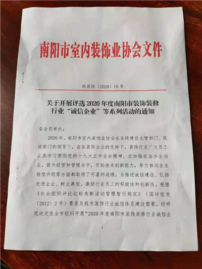 关于开展评选2020年度南阳市装饰装修行业“诚信企业”等系列活动的通知