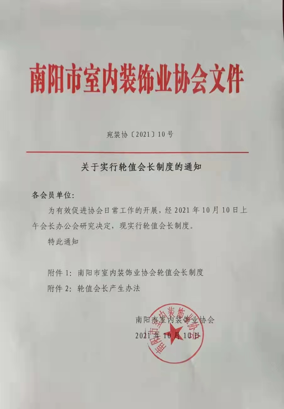 为有效促进南阳市室内装饰业协会(以下简称“协会”)日常工作开展,根据协会当前工作需要,特制定轮值会长制度。