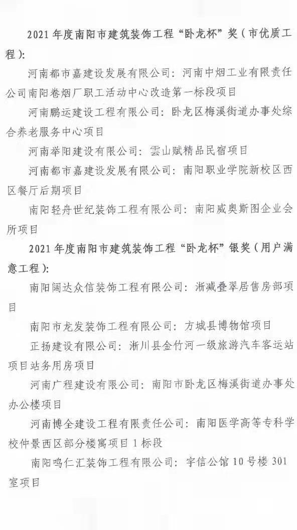 2021年度南阳市建筑装饰工程“卧龙杯”奖(市优质工程):